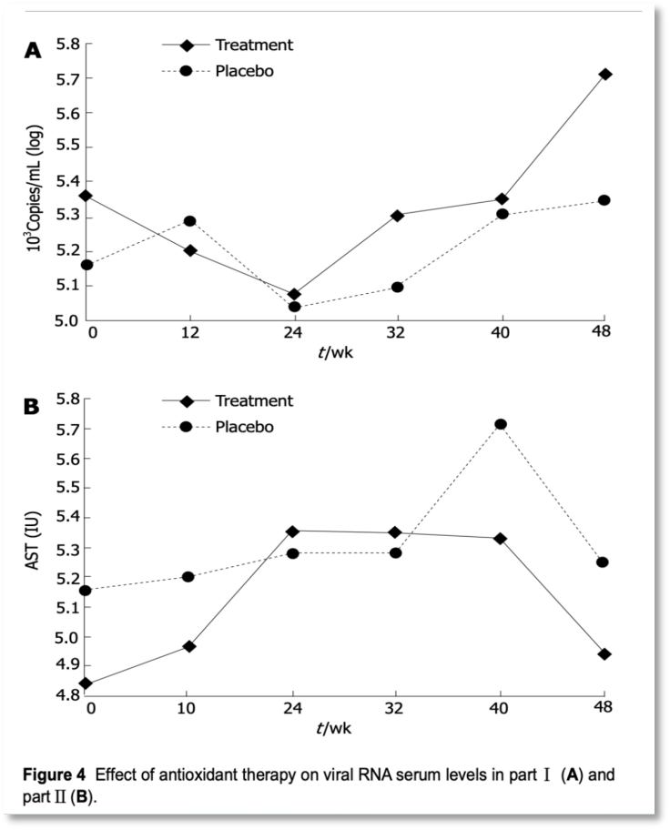 [2]Gabbay E., Zigmond E., Pappo O., Hemed N., Rowe M., Zabrecky G., Cohen R., Ilan Y. Antioxidant♠ therapy for chronic hepatitis C after failure of interferon: Results of phase II randomized, double-blind placebo controlled cliΩnical trial.World J. Gastroenterol. 2007;13:5317–5323. doi: 10.3748/wjg.v13.i40.5317.