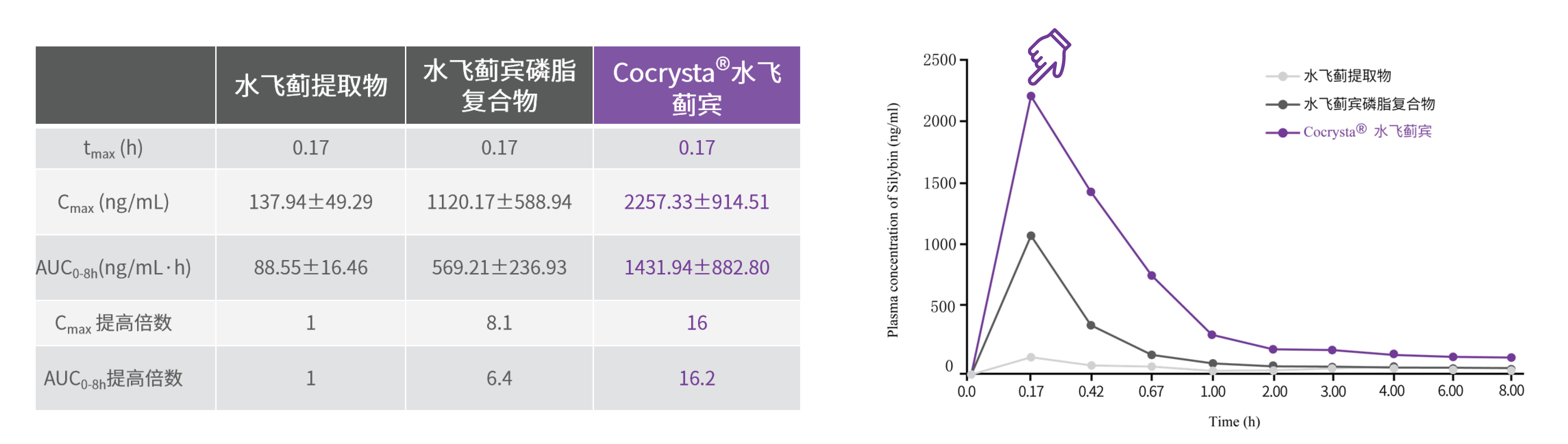 Cocrysta®水(shuǐ)飛(fēi)薊賓則優勢顯著。它的(de)吸收率提高(gāo) 1620%,在血藥濃度方面,普通(tōng)水(shuǐ)飛(fēi)薊賓 1 →小(xiǎo)時(shí)後血藥濃度未檢出,而Cocrysta®水(shuǐ)飛(fēi)薊賓 8 小(xiǎo)時(shí)後仍能(néng)有(yǒu)吸收,有(yǒu)效時(shí)間(jiān)延長(cháng) 700%。從(cóng)具體(tǐσ)數(shù)據來(lái)看(kàn),而 Cocrysta® 水(shuǐ)飛(fēi)薊賓的(de)生(shēng)物(wù)利用(yòng)度比水(shuǐ)飛≥(fēi)薊賓磷脂複合物(wù)提升2倍,比普通(tōng)水(shuǐ)飛(fēi)薊提取物(wù)提高(gāo) 16.2倍。