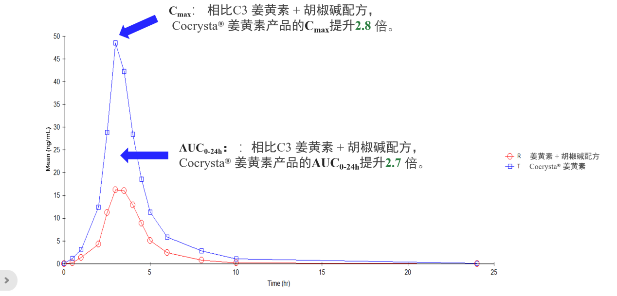 - 高(gāo)吸收率:人(rén)體(tǐ)實驗顯示,單次服用(yòng)共晶姜黃(huáng)素後,最大(dà)血藥濃度(Cmax)是(sβhì)C3 姜黃(huáng)素+胡椒堿配方的(de) 2.8 倍,藥時(shí)曲線下(xià)面積(AσUC)提升 2.7 倍。因此前已經有(yǒu)臨床驗證C3 姜黃(huáng)素+胡椒堿配方比普通(tōng)姜黃(huáng)AUC 0-24h提升了(le)20倍。因此,共晶姜黃(huáng)素實現(xiàn)相(xiàng)比較普通(tōng)姜黃(huáng)素實現(xiàn)了(le) “近(jìn)60 倍吸收率” 的(de)突破。