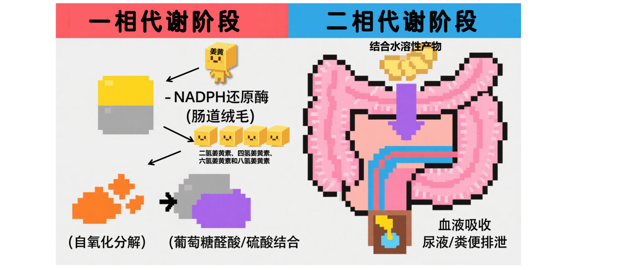 姜黃(huáng)素的(de)生(shēng)物(wù)活性在2相(xiàng)代謝(xiè)中失活。體(tǐ)內(nèi)代謝(xiè)≥迅速,半衰期短(duǎn),且易被肝髒和(hé)腸道(dào)的(de)葡萄糖苷酶降解。這(zhè)種“快(kuài)速代謝(xiè)”特性使得(de)其在體(tǐ)內(nèi)的(¶de)有(yǒu)效濃度難以維持,并且姜黃(huáng)素被快(kuài)速排洩,導緻姜黃(huáng)素的(de)生(shēng)物(wù)利用(yòng)度較低(dī)。€進一(yī)步削弱了(le)其治療潛力。