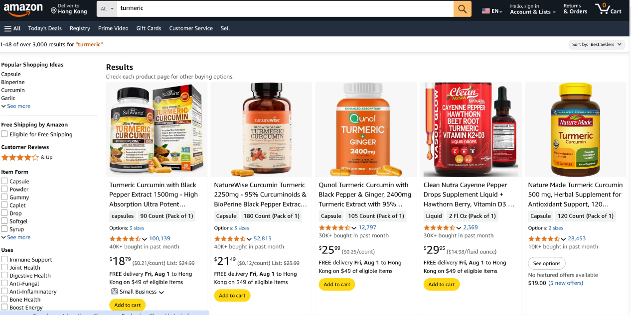 海(hǎi)外(wài)電(diàn)商平台上(shàng)使用(yòng)姜黃(huáng)的(de)功能(néng)性膳食補充劑也(yě)可(k÷ě)以達到(dào)10萬瓶的(de)火(huǒ)爆銷量。