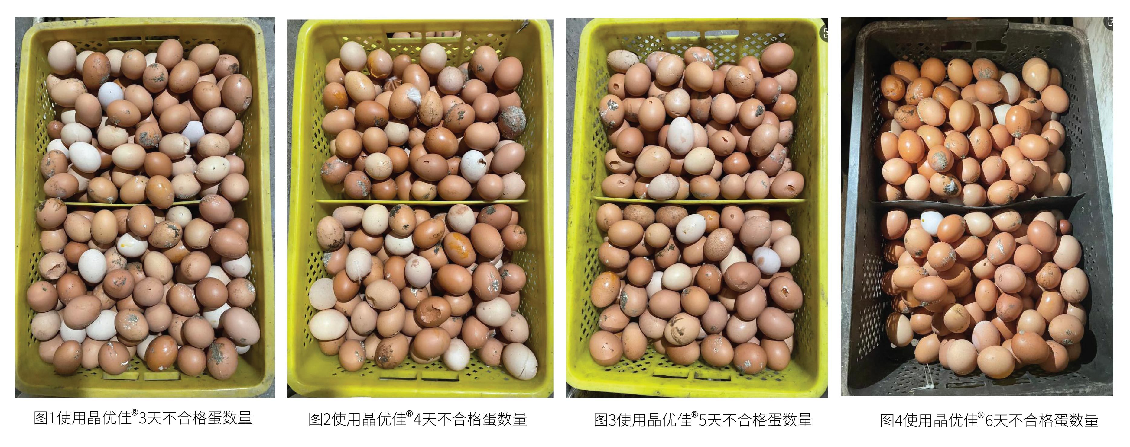 - 不(bù)合格蛋大(dà)幅減少(shǎo):使用(yòng)晶優佳®6天後,破蛋、沙皮蛋、白(bái)皮蛋數(shù)量明(míng)顯減少(shǎo),蛋殼顔色和(hé)光(guāng)澤度顯著提高(gāo)。