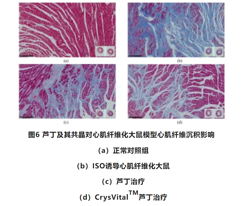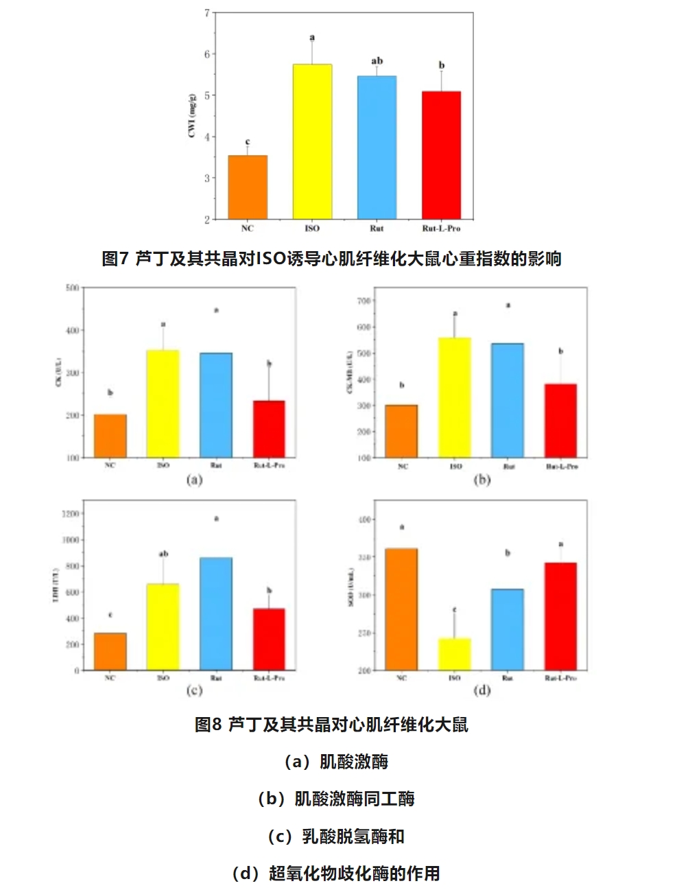 采用(yòng)異丙腎上(shàng)腺素誘導的(de)心肌纖維還(hái)模型對(duì)蘆丁及其共晶的(de)心肌保護功效進行(xíng)評價£。結果表明(míng),CrysVitalTM蘆丁更加明(míng)顯的(de)緩解心肌間(jiān)質膠原纖維沉積及心肌肥大(dà)等症狀的(de)作(zuò)用(yò™ng)效果(如(rú)圖6、圖7所示)。此外(wài),補充蘆丁及其共晶還(hái)可(kě)顯著降低( dī)心肌損傷标志(zhì)物(wù)肌酸激酶、肌酸激酶同工(gōng)酶和(hé)乳酸脫氫酶的(de)作(zuò)用(yòng),且在同等給藥劑量下(x∞ià),CrysVitalTM蘆丁的(de)作(zuò)用(yòng)效果更佳顯著。且蘆丁及CrysVitalTM蘆丁還(hái)可(kě)通(tōng)過增加體(tǐ)內(nèi)抗氧化(huà)酶活性顯著改善大(dà)鼠體(tǐ)內(nèi)的(de)抗氧 化(huà)應激狀态,且CrysVitalTM蘆丁具有(yǒu)更優的(de)作(zuò)用(yòng)效果(如(rú)圖8所示)。