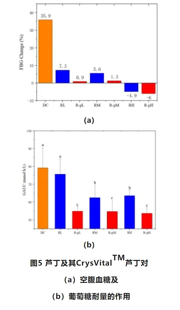采用(yòng)鏈脲佐菌素誘導的(de)糖尿病模型對(duì)市(shì)售蘆丁及CrysVitalTM蘆丁的(de)降血糖功效進行(xíng)了(le)評價。結果表明(míng),CrysVitalTM蘆丁具有(yǒu)更佳顯著的(de)降低(dī)空(kōng)腹血糖及葡萄糖耐受的(de)作(zuò)用(yòng)。糖尿病模β型大(dà)鼠的(de)空(kōng)腹血糖相(xiàng)較于初始值升高(gāo)了(le)35.9%,而使用(yòng)蘆丁及CrysVitalTM蘆丁治療可(kě)以将空(kōng)腹血糖值控制(zhì)在穩定水(shuǐ)平內(nèi),且CrysVitalTM蘆丁維持血糖穩定的(de)作(zuò)用(yòng)效果更加明(míng)顯(50 mg/kg蘆丁治療FBG升高(g↑āo)7.3%,CrysVitalTM蘆丁僅增加0.9%),且連續服用(yòng)高(gāo)劑量蘆丁(300 mg/kg)具有(yǒu)顯著的(de)降低(dī)空(kōng)腹血糖的(de)作(zuò)用(yòng★)(-6%)。此外(wài),相(xiàng)比于糖尿病模型大(dà)鼠,使用(yòng)蘆丁及CrysVitalβTM蘆丁治療均能(néng)顯著降低(dī)大(dà)鼠的(de)葡萄糖耐量,且共晶低(dī)劑量的(de)作(zuò)用(yòng)效果優于原料高(gāo)劑量(如(rú)§圖5所示)。