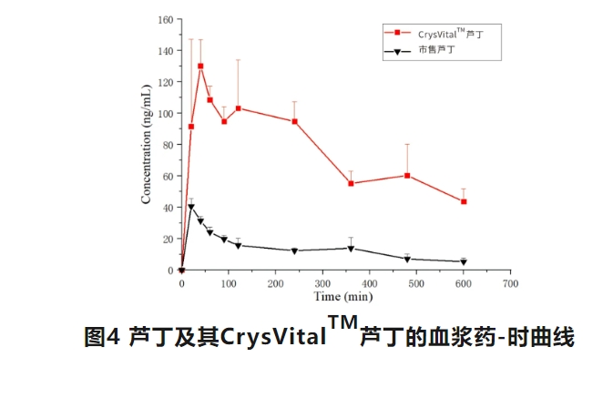 口服同等劑量的(de)市(shì)售蘆丁原料和(hé)CrysVitalTM蘆丁,可(kě)顯著提高(gāo)蘆丁的(de)口服體(tǐ)內(nèi)暴露量。相(xiàng)比于市(shì)售蘆丁,Cr∏ysVitalTM蘆丁的(de)最高(gāo)血藥濃度(Cmax)是(shì)市(shì)售蘆丁的(de)3.8倍,血漿藥-時(shí)曲線下(xià)面積是(shì)市(shì)售蘆丁的(de)5.6倍(如(rú)圖4所示)。綜上(shà<ng),認為(wèi)CrysVitalTM蘆丁具有(yǒu)比原料更優的(de)藥代動力學參數(shù)和(hé)更高(gāo)的(de)生(shēng)物(wù)利用(yòng)度↓。