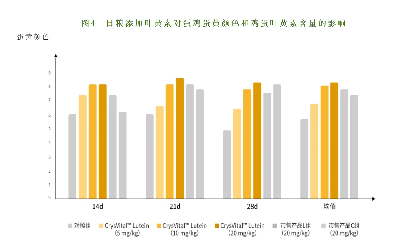 日(rì)糧添加1/2劑量葉黃(huáng)素(CrysVital TM Lutein 産品10 ppm),與L組相(xiàng)比,CrysVital TM Lutein(10 mg/kg)組蛋黃(huáng)顔色提升4.5%;與C組相(xiàng)比,CrysVital TM Lutein(10 mg/kg)組蛋黃(huáng)顔色提升9.1%