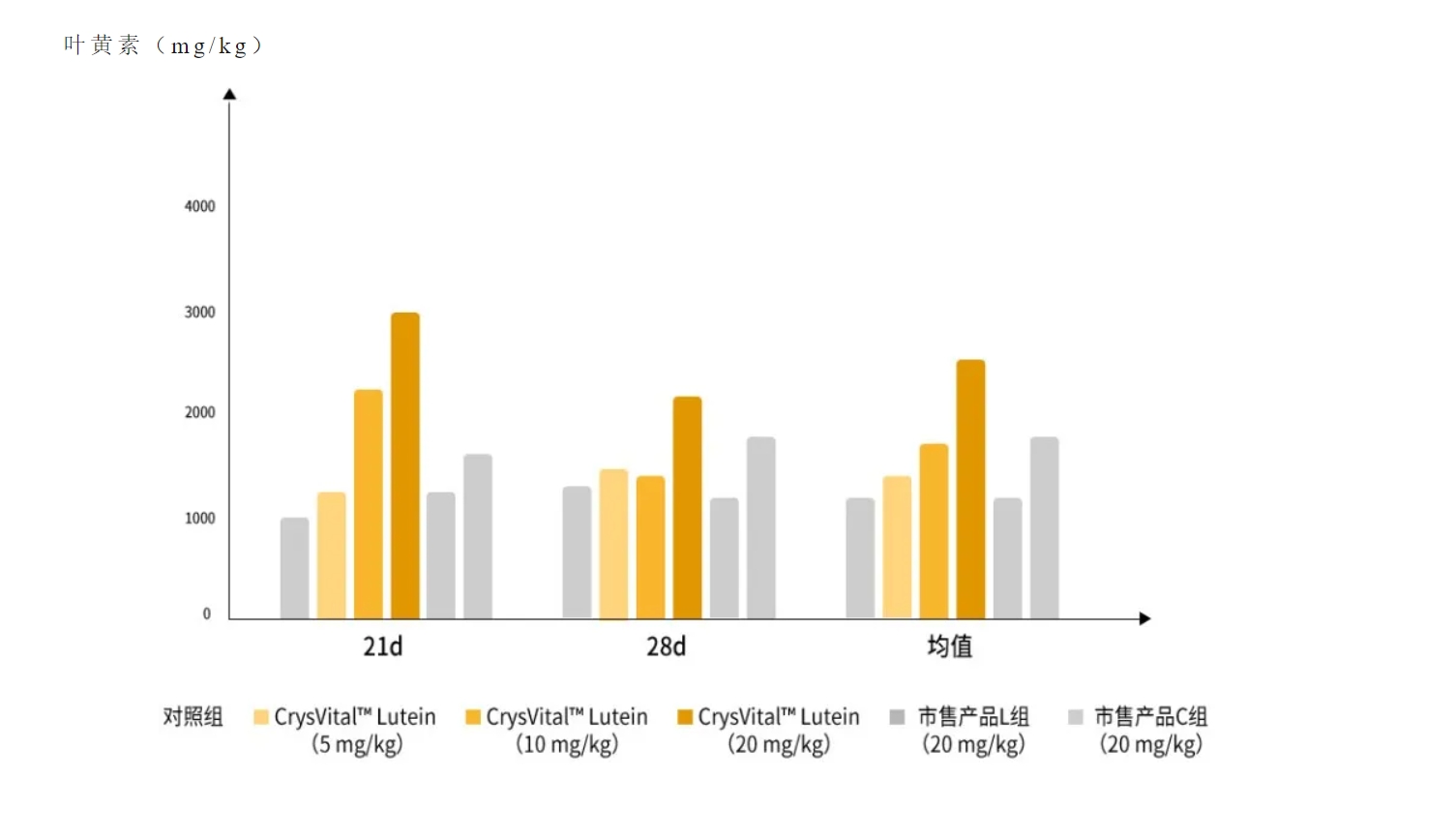 日(rì)糧添加1/2劑量葉黃(huáng)素(CrysVital TM Lutein 産品10 ppm),與L組相(xiàng)比,CrysVital TM Lutein(10 mg/kg)組血液葉黃(huáng)素含量提高(gāo)464.2 ng/ml(1674.7 ng/ml vs 1210.5 ng/ml);與C組相(xiàng)比,CrysVital TM Lutein(10 mg/kg)組血液葉黃(huáng)素含量接近(jìn)(1674.7 ng/ml vs 1754.0 ng/ml)。