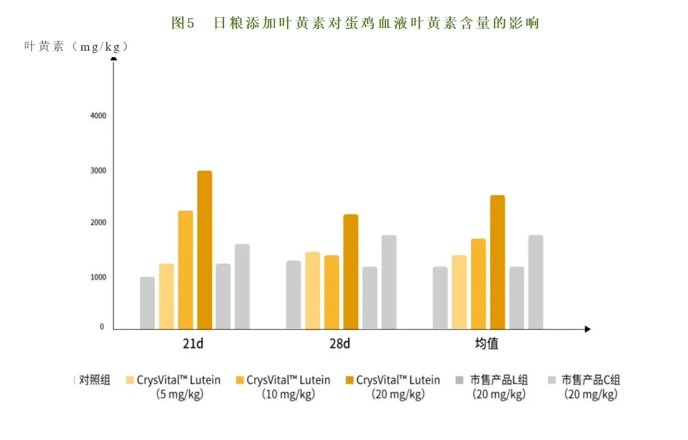 (2)由圖5可(kě)知(zhī),與對(duì)照(zhào)組相(xiàng)比,實驗21d時(shí),CrysVital TM Lutein(10 mg/kg和(hé)20mg/kg)組血液葉黃(huáng)素含量顯著高(gāo)于其他(tā)四組(P < 0.01)。