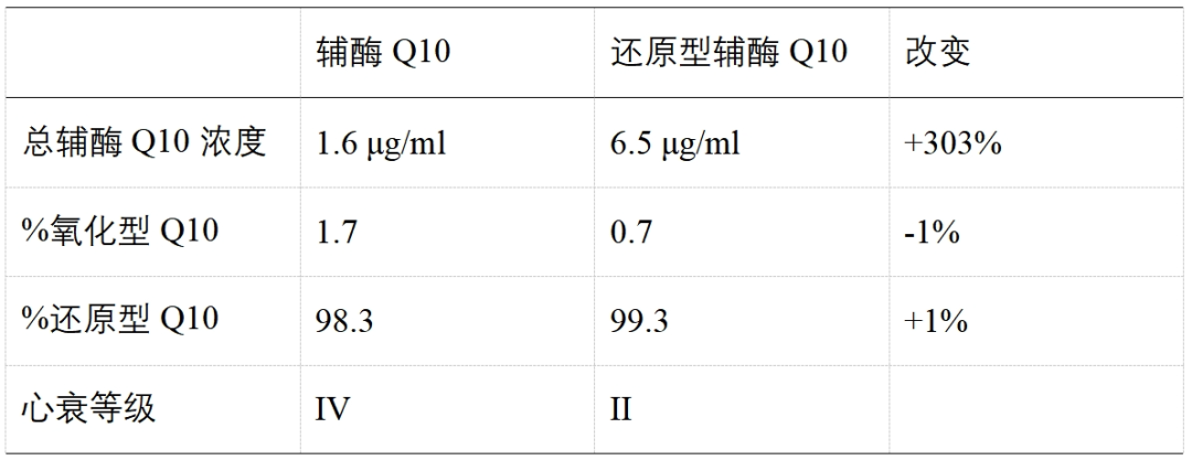 美(měi)國(guó)東(dōng)德克薩斯醫(yī)療中心的(de)Peter H. Langsjoen教授選擇7名接收輔酶Q10輔助治療,但(dàn)是(shì)血藥濃度仍然低(dī)于2.5 μ g/ml 的(de)NYHA IV級心力衰竭病人(rén)來(lái)進行(xíng)還(hái)原型輔酶Q10替代輔酶Q10的(de)臨床試驗1。研究過程中,将心衰患者的(de)給藥方式由每天口服450mg輔酶Q10改變為(wèi)每天口服還(hái)原型輔酶Q10 560 mg。試驗結果如(rú)表1所示。口服輔酶Q10時(shí),病人(rén)體(tǐ)內(nèi)總輔酶Q10的(de)血藥濃度為(wèi)1.6 μ g/ml,其中氧化(huà)型輔酶Q10占比1.7%,還(hái)原型輔酶Q10占比98.3%。改為(wèi)口服還(hái)原型輔酶Q10後,病人(rén)體(tǐ)內(nèi)總輔酶Q10的(de)血藥濃度提升到(dào)6.5 μ g/ml,提高(gāo)303%;其中氧化(huà)型輔酶Q10占比0.7%,降低(dī)1%;還(hái)原型輔酶Q10占比99.3%,提高(gāo)1%。所有(yǒu)病人(rén)的(de)心衰症狀全都(dōu)得(de)到(dào)改善,心衰症狀平均由NYHA IV級改善到(dào)NYHA II級,其中有(yǒu)2人(rén)改善到(dào)I級,2人(rén)改善到(dào)II級,還(hái)有(yǒu)3人(rén)改善到(dào)III級。