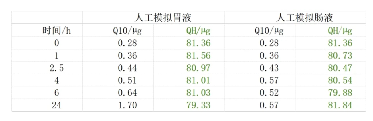 為(wèi)此,中國(guó)科(kē)學院國(guó)家(jiā)級實驗室進行(xíng)了(le)系"統性的(de)研究實驗,具體(tǐ)操作(zuò)如(rú)下(xià):将 50ml 人(rén)工(gōng)胃液或人(rén)工(gōng)腸液保溫在 37℃,加入 1 粒還(hái)原型輔酶™ Q10 共晶硬膠囊(總重 200mg,其中含還(hái)原型輔酶 Q10 共晶 80mg),控制(zhì) 100 轉/分(fēn)鐘(zhōng) 攪拌速度,分(fēn)别于 0h,1h,2.5h,4h,6h,24h 各取出一(yī)份,測定溶液中 Q10 和(hé) QH 的(de)含量。結果表₩明(míng),還(hái)原型輔酶 Q10 在 37℃人(rén)工(gōng)模拟胃液、人(rén)工(gōng)模拟腸液中溶解度遠(yuǎn)遠(yuǎn)高(gāo)于氧•化(huà)型輔酶,且 24h 後仍然能(néng)穩定存在,沒有(yǒu)出現(xiàn)大(dà)量被氧化(huà)或者含量急劇(jù)下(xi≠à)降等情況,保持了(le)良好(hǎo)的(de)穩定性,這(zhè)為(wèi)其後續能(néng)以較高(gāo)的(de)生(shē ng)物(wù)利用(yòng)度被人(rén)體(tǐ)吸收提供了(le)有(yǒu)力證據,結果詳見(jiàαn)表格 1。
