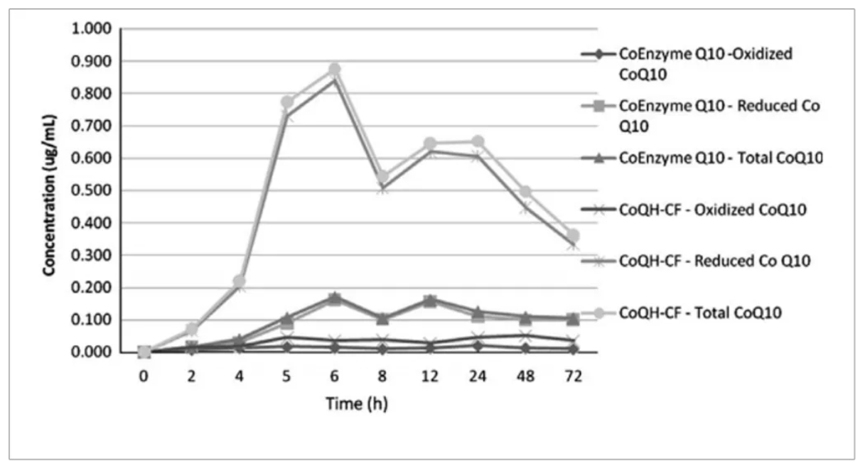 服用(yòng)氧化(huà)型和(hé)還(hái)原型輔酶Q10後的(de)藥代動力學曲線對(duì)比↕