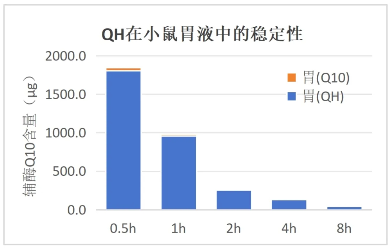 試驗結果顯示,空(kōng)白(bái)組小(xiǎo)鼠中胃、小(xiǎo)腸中 QH 和(hé) Q10 含量均為(wè&i) 0。而給藥組小(xiǎo)鼠胃、小(xiǎo)腸中 QH 和(hé) Q10 含量測定結果顯示,盡管"小(xiǎo)鼠胃、小(xiǎo)腸中 QH 含量個(gè)體(tǐ)差異較大(dà),但(dàn)均顯示小(xiǎo)&鼠胃中在任何時(shí)間(jiān)點均主要(yào)以 QH 型式存在。在小(xiǎo)腸中,除小(xiǎo)部分(fēn)被氧化(huà)成 Q10 以外(wài),0 - 8h 內±(nèi) 80%以上(shàng)仍然以還(hái)原型型式存在,說(shuō)明(míng) QH 在到(dào)達小($xiǎo)腸末端時(shí)并不(bù)會(huì)轉化(huà)為(wèi) Q10。