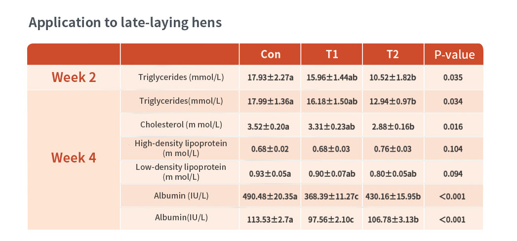 Application in laying hens: The level of triglyceride in serum of laying hens  decreased by 40%, and th×e level of total cholesterol, alanine aminotransferase (ALT),asparta₹te aminotransferase (AST) are also significantly decreased.