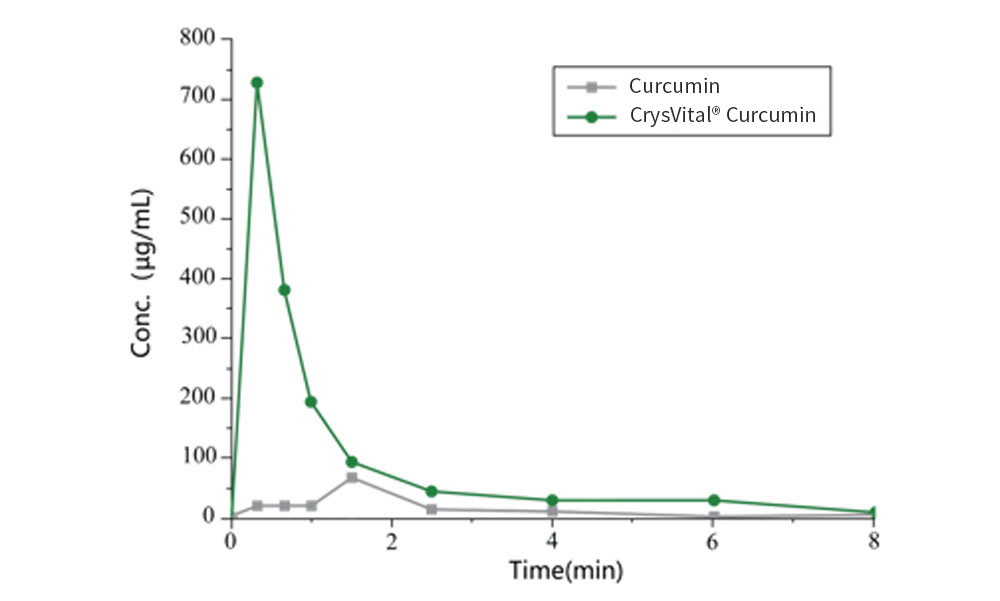 Result: Maximum blood concentration of CrysVital® curcumin was 10.7× higher than that of↕ standard curcumin.