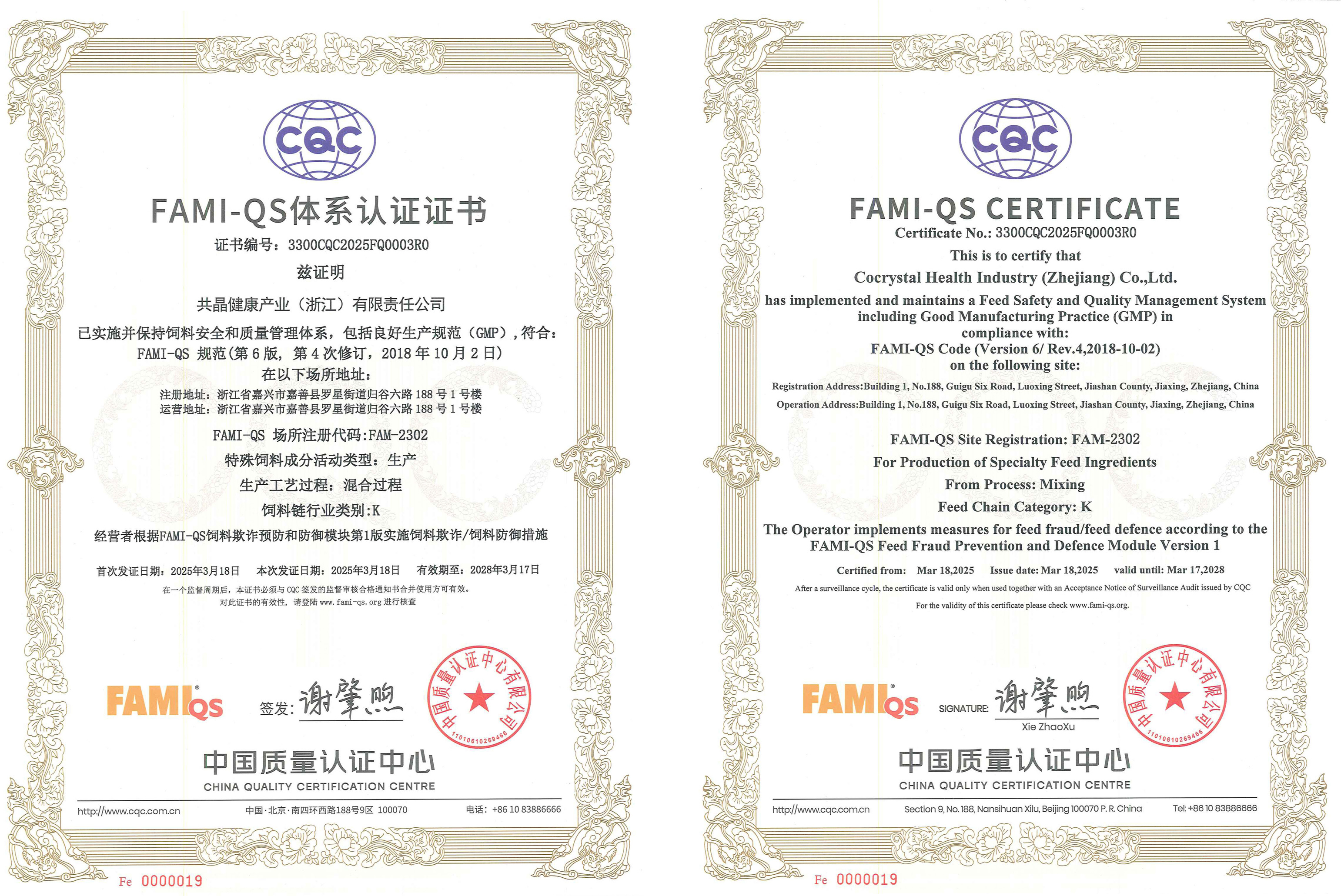 FAMI-QS, namely the European Feed Additives and Premix Quality System, as a recognized stπringent standard in the international feed industry. This certification process covers stricΩt audits of the entire industrial chain, ranging from raw material procurement, pro∞duction processes, quality control to product traceability. This certification sys<tem not only requires enterprises to follow Good Manufacturing Pra ctice (GMP), but also sets extremely high thresholds in multiple dimπensions such as hygiene standards, risk management, and personnel qualifications.☆ Obtaining the FAMI-QS certification means that the p©roducts and services of Cocrystal Technology have rβeached the leading level in Europe and even globally, and possess the stron♥g strength to participate in international market competitioφn.