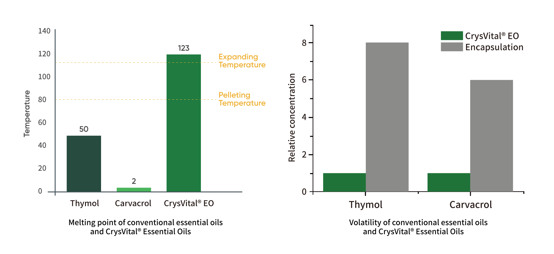 Compared to conventional essential oils, CrysVital® Essential Oils has a higher melting point and ♣lower volatility. This is more suitable for pelleting and expand←ing process of the animal feed.